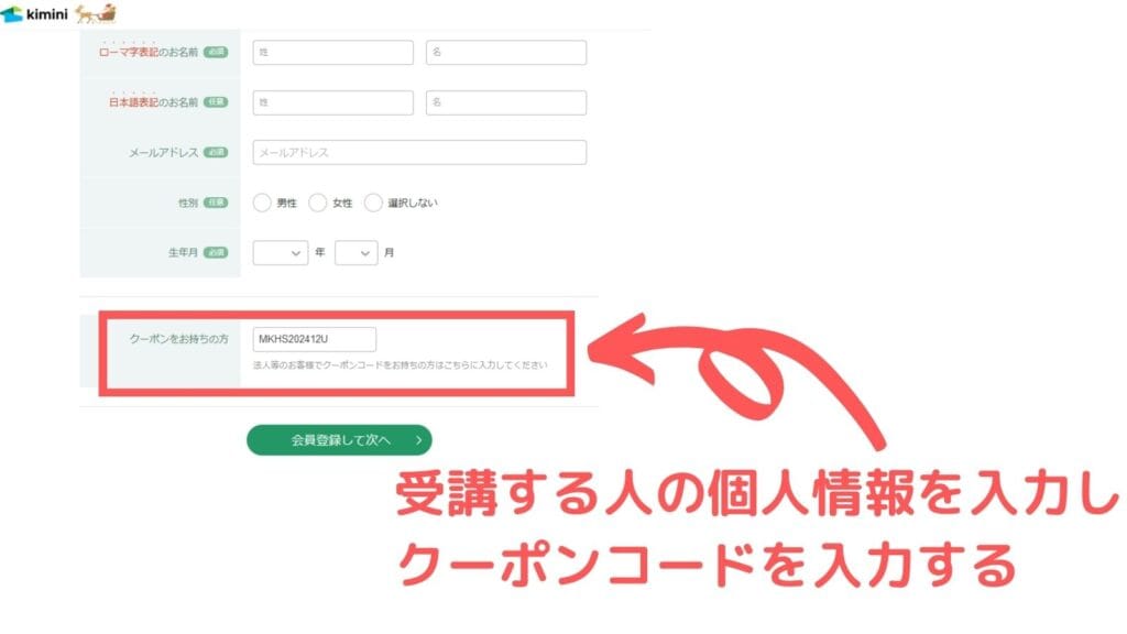 受講する人の個人情報を入力し、クーポンコードを入力したら「会員登録して次へ」をクリックします。