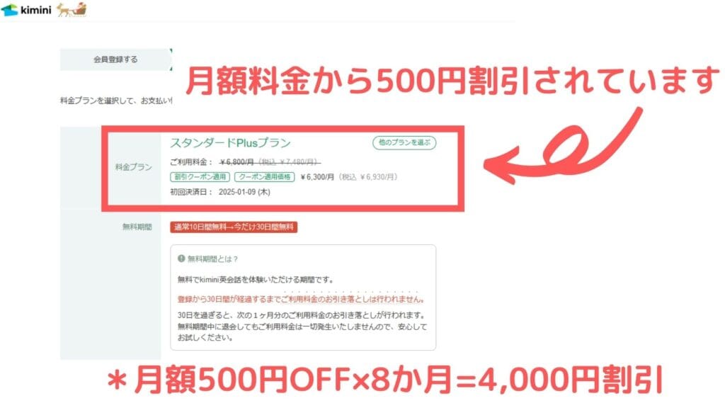 今回ご紹介したリンク(Kiminiオンライン英会話 )から公式サイトにいって、限定クーポンコード(MKHS202412U)を入力された場合のみ40日間無料&4,000円割引が適用されます。