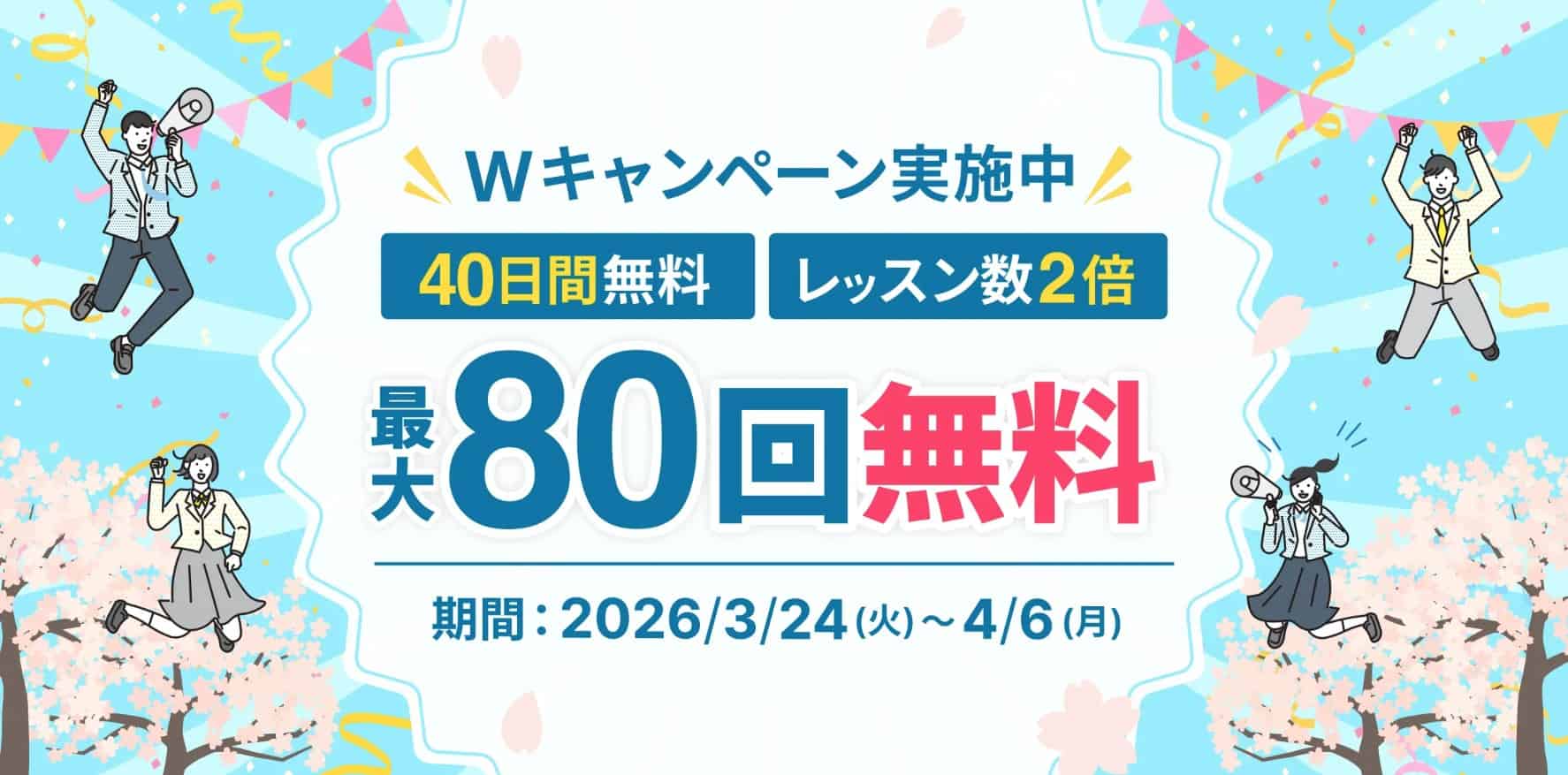 | 無料体験 | 40日間無料キャンペーン中 さらに限定クーポンで 8,400円割引になります! (2026年4月6日まで) |