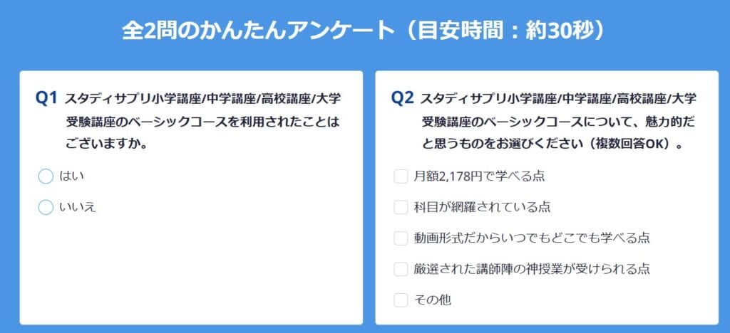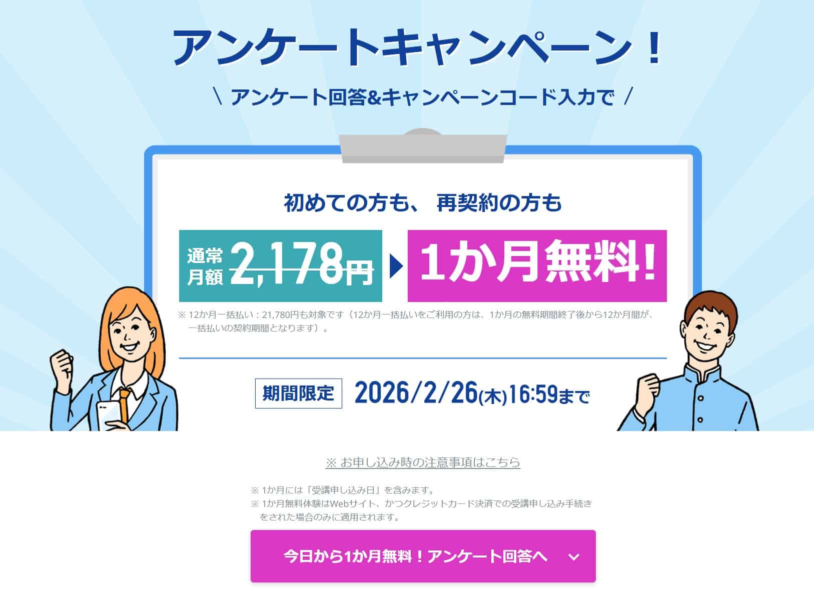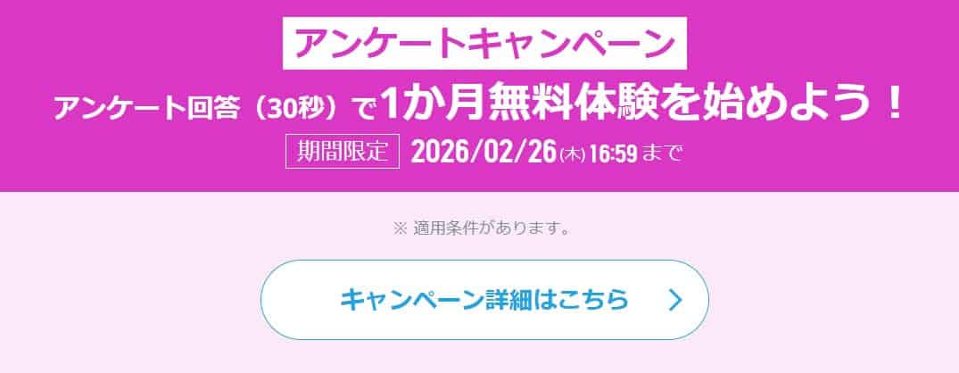 アンケートに回答すると、キャンペーンコード付きの「1か月無料クーポン」がもらえます!